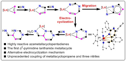 Exploring new lanthanide metallacycles and finding their unique chemistry different from the analogues of transition metals are of great interest and importance. In this work, we reported the synthesis, characterization and reactivity toward nitriles of two lanthanide metallacyclopropenes: lutetacyclopropene 2a and dysprosacyclopropene 2b. The selective coupling of 2a and three molecules of PhCN was found for the first time to provide an unexpected fused lutetacycle 3a with one 1,6-dihydropyrimidine ring. Mechanistic studies by DFT calculations reveal that the triple insertion of PhCN into 2a proceeds through four key steps: the insertion of the first PhCN into 2a giving azalutetacyclopentadiene IM1, the insertion of the second PhCN into the Lu−N bond of IM1, the intramolecular electrocyclization providing a highly strained η2-pyrimidine metallacycle, and the insertion of the third PhCN into the Lu−Csp3 bond. Isolation and characterization of two active intermediates: azalutetacyclopentadiene IM1 and η2-pyrimidine dysprosacycle provide critical evidences for the formation of 3a. Furthermore, IM1 was also reported to react with TMSCN, isocyanides or W(CO)6 to furnish the fused [4,5] lutetacycles. The chemistry of two lanthanide metallacyclopropenes with nitriles is significantly different from these metallacyclopropenes of scandium and other metals. Most notably, the azalutetacyclopentadienes, η2-pyrimidine complex, and other metallacycles all represent the first examples in rare-earth organometallic chemistry; the formation of these new lutetacycles provides concrete evidences for understanding the mechanism of transition metal promoted or catalyzed [2+2+2] cycloaddition between alkynes and nitriles.