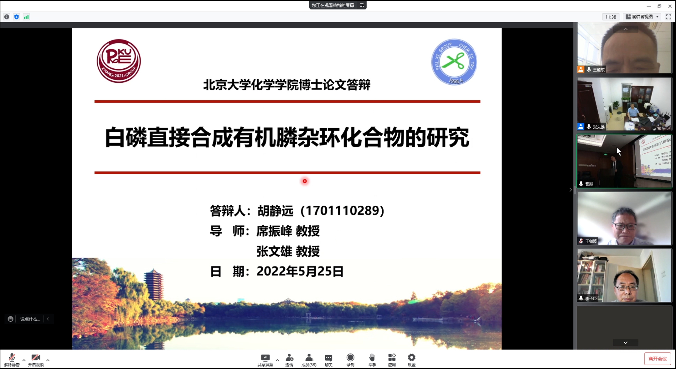 研究室举行博士论文答辩 时间:2022-05-27 来源:作者: 字体: 【小】 【中】 【大】 2022年5月25日,研究室举行博士论文答辩。由于疫情影响,本次答辩通过腾讯会议以线上视频方式进行,席振峰教授和张文雄教授共同指导的17级研究生胡静远在化学学院A205教室现场参加。胡静远同学准备细致充分,科研努力,工作充实。经答辩委员会专家评审一致通过,建议授予博士学位。 感谢胡静远同学多年来为课题组做出的杰出贡献,以及留下的精彩瞬间。离开了熟悉的实验室,走上了新的工作、科研、生活道路,研究室祝福他前程似锦,在新的岗位上工作顺利!