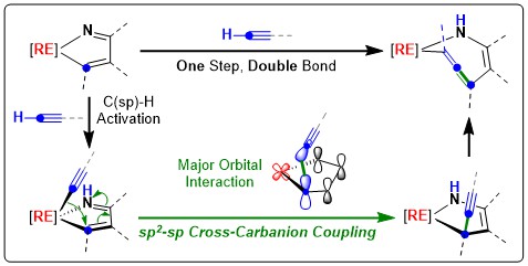 In contrast to transition metals, rare-earth metal promoted sp2-sp carbon-carbon coupling through reductive elimination cannot be realized due to the inaccessibility of two-electron metal-based redox couples. Herein, we report that sp2-sp cross-carbanion coupling has been realized in the reaction of rare-earth azametallacyclopentadienes toward alkyl and aryl terminal alkynes. The reaction of rare-earth azametallacyclopentadienes, which are in situ generated from rare-earth metallacyclopropenes and nitriles, with terminal alkynes provides a new class of seven-membered rare-earth metallacycles containing cumulated double bonds. The structure of seven-membered rare-earth metallacycles has been fully characterized. Mechanistic studies by DFT calculations and principal interacting orbital (PIO) analysis reveal that the formation of seven-membered rare-earth metallacycles proceeds through three steps: the activation of the alkynyl C−H bond in terminal alkynes, followed by the sp2-sp cross-carbanion coupling and subsequent alkynyl-to-allenyl isomerization to form a new C−C double bond, providing the seven-membered rare-earth metallacycles.