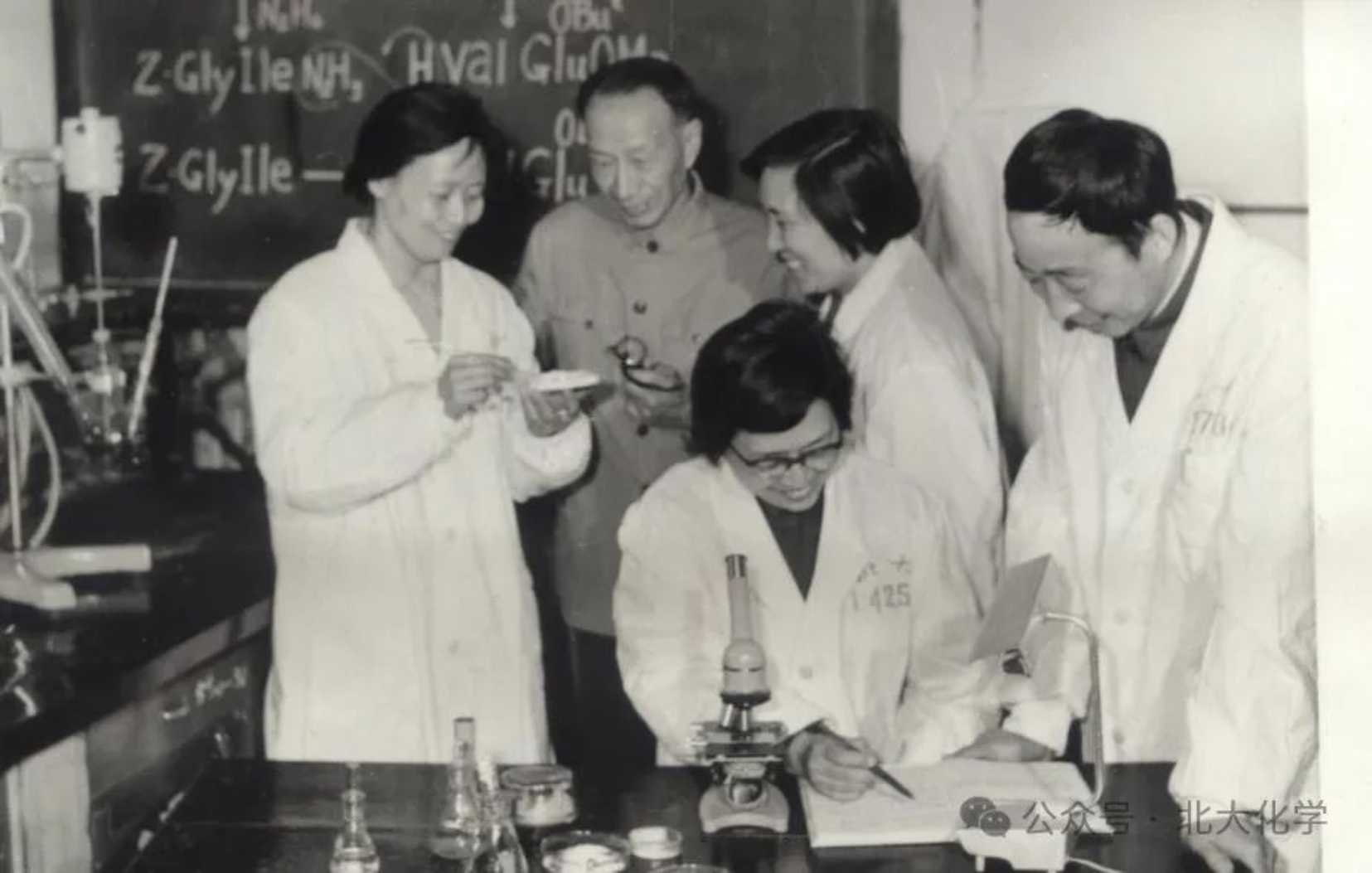 “当时北大的教学任务十分繁重,但为了顾全大局,1964年3月抽调五位年轻教师在有机教研室主任邢其毅教授和副系主任文重老师带领下,到上海有机所参加胰岛素A链的合成。在北大成员中有师姐季爱雪、师兄陆德培、李崇熙、施溥涛,而我是刚毕业不久的最年轻的助教,后来还有一位比我更年轻的汤卡罗作为邢先生的研究生加入了牛胰岛素合成的研究。我们与有机所的徐杰诚、张伟君、陈玲玲、钱瑞卿、李鸿绪和几位实验辅助人员王思清、刘永福与姚月珍密切合作进行胰岛素A链的合成。”