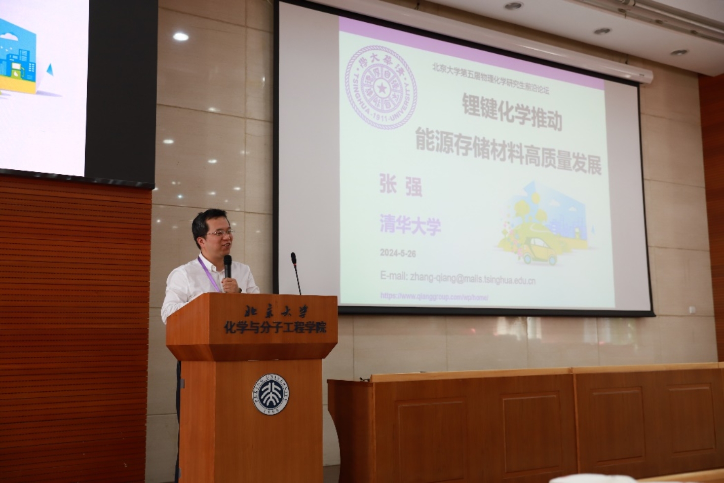 5月26日下午,论坛还邀请了活跃在科研前沿的清华大学张强教授作邀请报告。张老师从国家能源和需求讲起,解释了锂金属的独特优势,介绍了锂键化学推动能源储存材料高质量发展方向的前沿进展,亲和风趣而不失严谨的讲演风度给同学们留下了深刻印象,为在座所有同学树立了非常好的学习榜样。