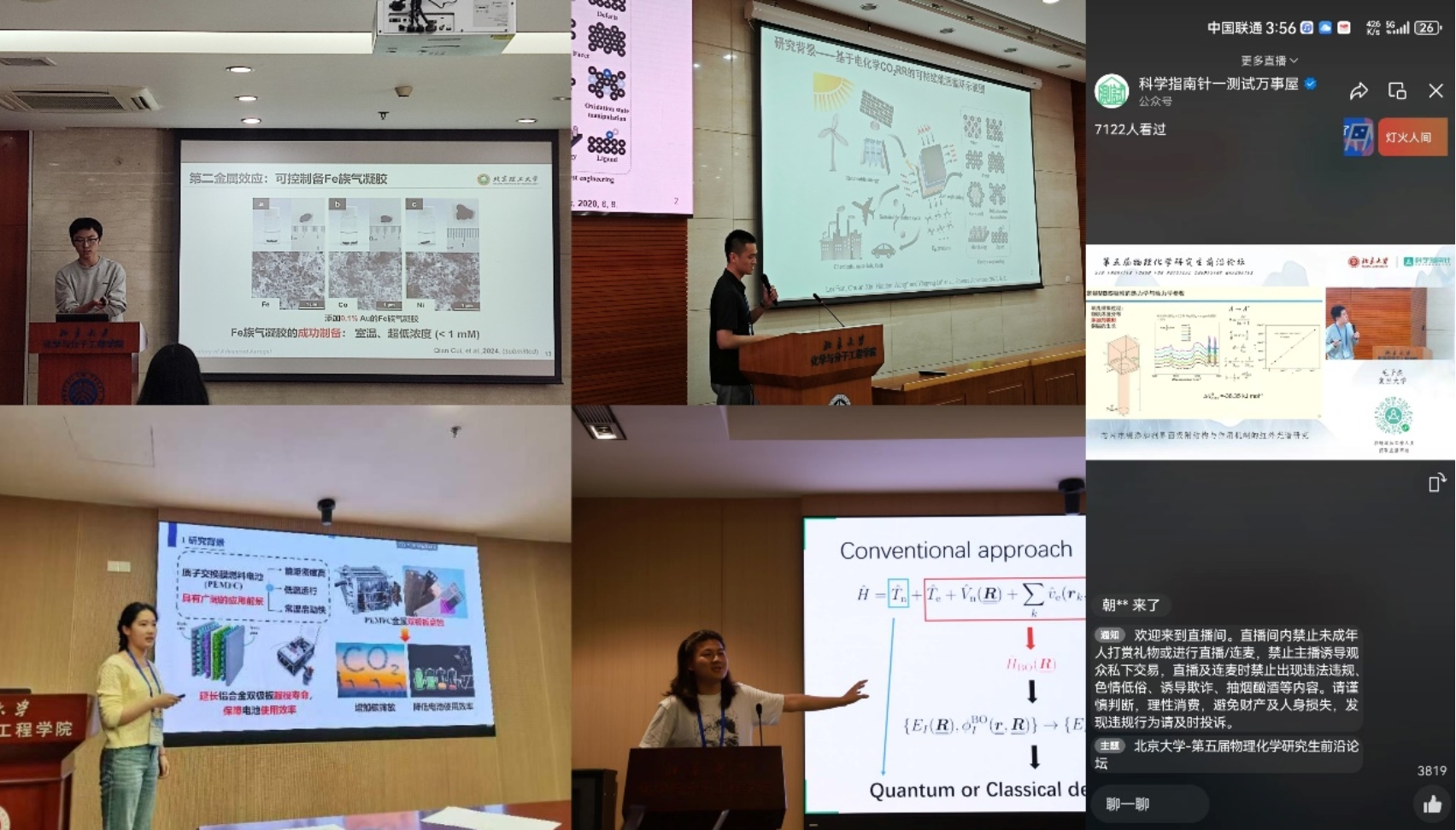 5月26日研究生学术交流以口头报告的形式呈现,论坛设置材料与胶体、催化与表面动力学、理论计算与生物物理化学、纳米化学与二维材料四个分会场,反映了物理化学学科的不断发展以及与其他学科的交叉融合。近50位同学做了精彩的口头报告,与会代表通过热烈的学术讨论和交流,迸发出新的学术思想,促进了各自科研工作的进展。活动全程线上同步直播,实时观看人数达到七千人。