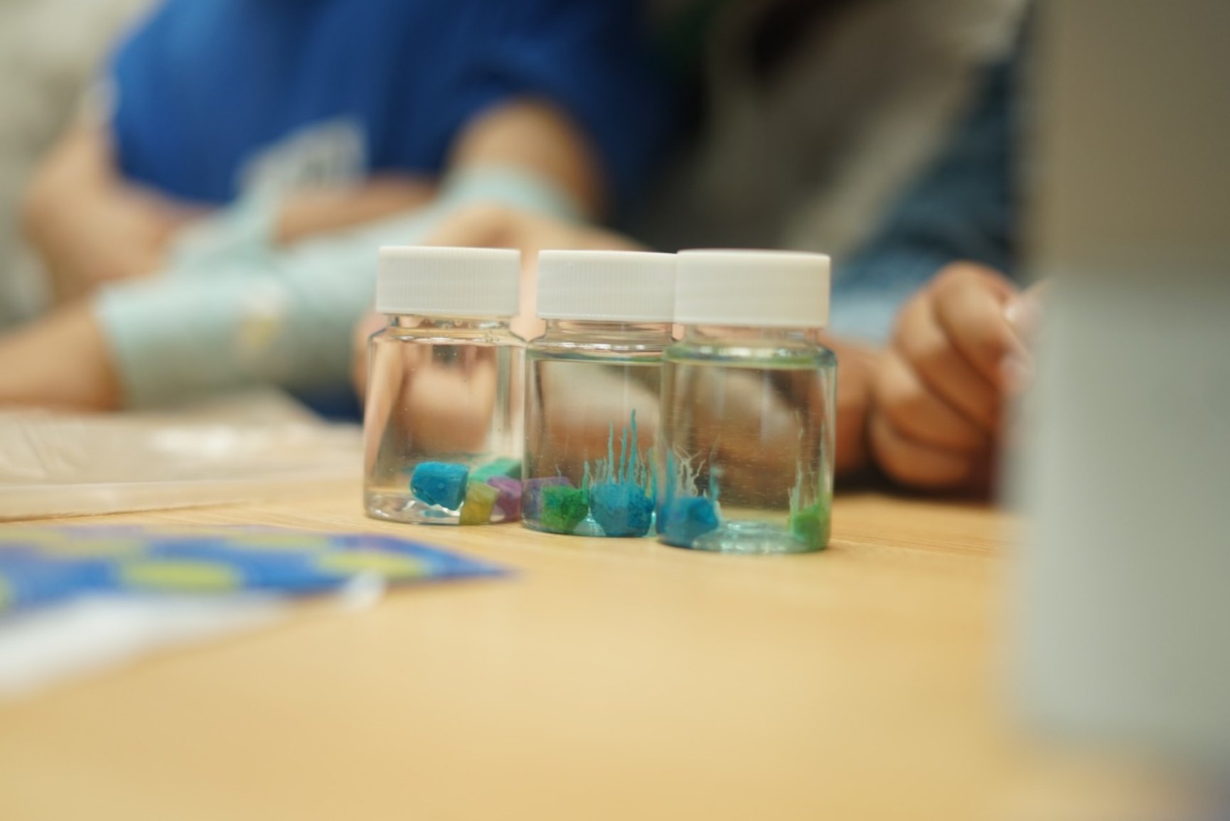 无机化学体验区的“海底世界”实验吸引了一大群人围观。当晶体在溶液中逐步生成五彩斑斓的硅酸盐结晶时,观众们惊叹于化学世界的奇妙和美丽,不少手机摄像头被举起,试图捕捉这一瞬间的美景。