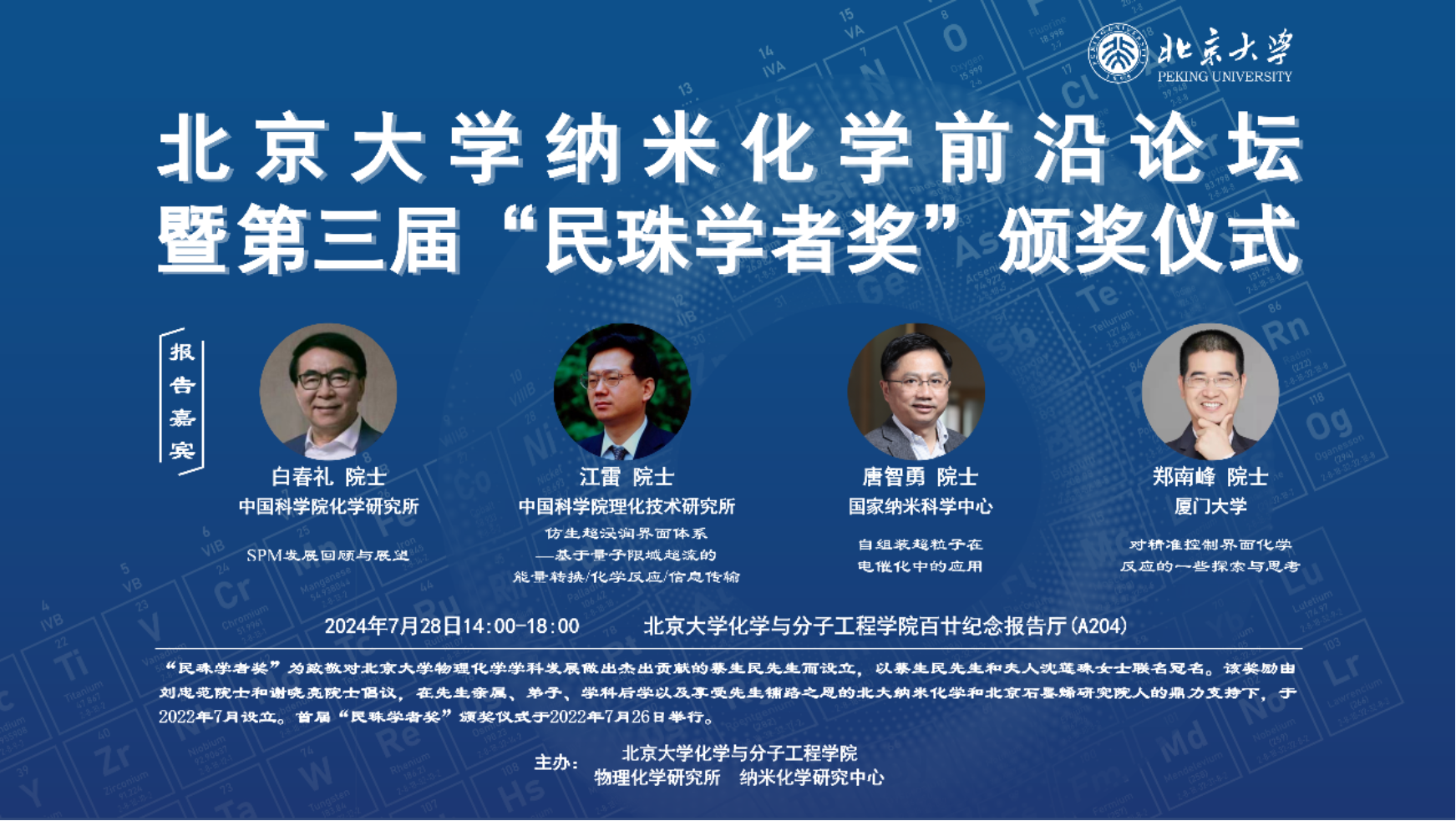 2024年7月28日,由3003新葡官方网站主办的3003新葡官方网站纳米化学前沿论坛暨第三届“民珠学者奖”颁奖仪式在3003新葡官方网站百廿纪念报告厅(A204)成功举行。本次活动汇聚了我国表界面物理化学与纳米科技领域的杰出专家、学者及雄安新区的相关领导,他们共同见证了这一学术盛会。