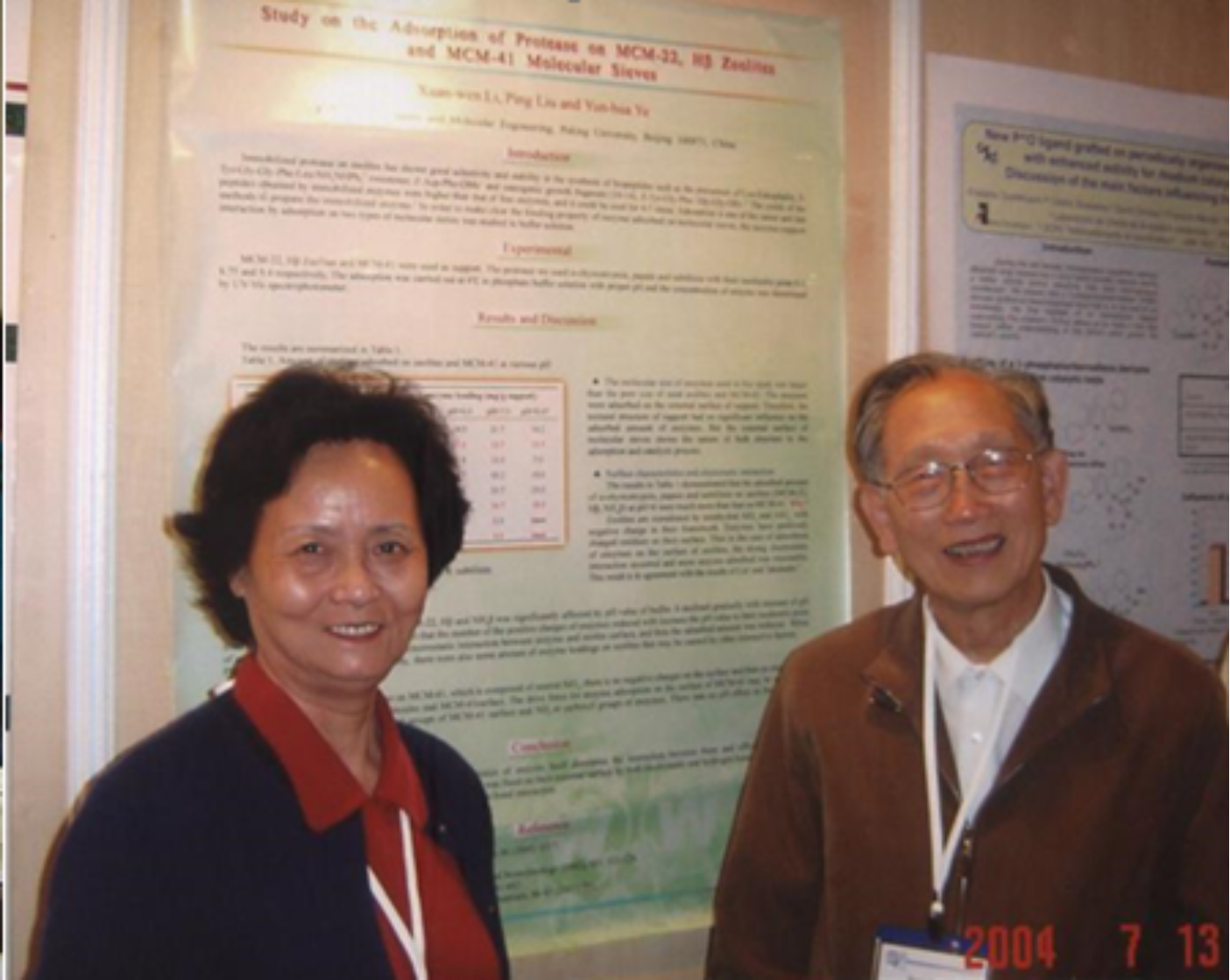 “1998年退休后,我与叶蕴华课题组的博士生邢国文合作从事分子筛固定化酶方面的研究。关于酶催化作用的重要性,人们常用‘没有酶催化就不会有任何生命现象’来表述。在人的生命过程中,酶的催化作用无处不在。酶催化的反应活性高、反应条件温和、具有高度的专一性和选择性,反应速度往往比非催化反应快许多个数量级。但酶的分子十分娇嫩,很容易失活,不易在有机合成中广泛使用。而且酶用作催化剂时往往不能反复使用。为了克服这个缺点,我们将胰凝乳蛋白酶、枯草杆菌蛋白酶,分别固定在不同结构的分子筛上,制备成分子筛固定化酶催化剂,研究不同分子筛的结构与反应条件对形成肽键的影响。成功地合成了甜味肽前体、亮脑啡肽片段。其中有的分子筛固定化酶效果较好,可以多次使用,在有机与生物合成方面具有潜在的应用前景。这些研究结果在美国、法国、日本、韩国等国的国际学术会议上交流后,引起国内外同行的关注。因为当时还未见分子筛固定化蛋白水解酶,在非水介质中合成肽键的报道,我们的第一篇文章于2000年在国际著名杂志上发表后,很快收到美国杂志主编Jack Cazes博士的邀请,请我们写一篇综述。后来我和叶蕴华及她的博士生闫爱新合作撰写了一篇分子筛固定化酶的综述,发表在他们的杂志上。分子筛固定化酶在非水介质中合成寡肽的研究成果,于2004年先后在巴黎举行的第十三届国际催化会议和在日本福冈举行的第一届亚太地区国际多肽会议上进行交流,还应邀在日本大阪府立大学与京都药科大学做学术报告。”