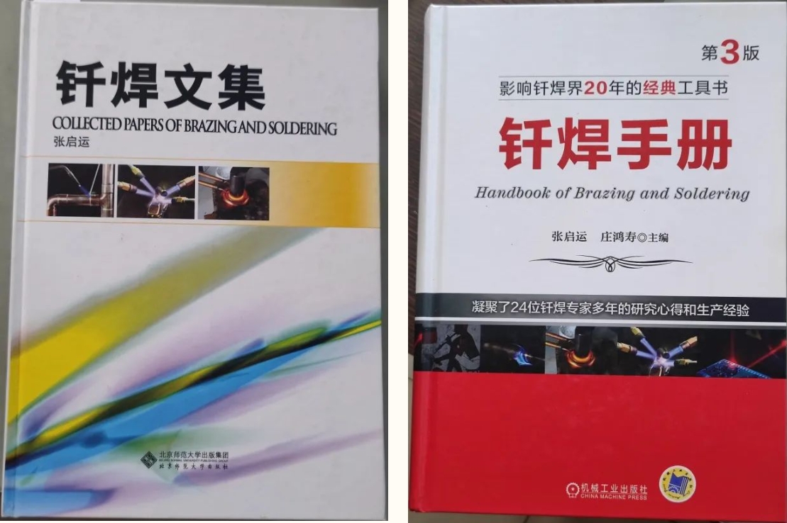 《钎焊文集》是张老师在多年来从事钎焊技术研究过程中,对钎焊材料(包括钎剂和钎料)及其与母材间反应机制研究的总结。选录了张老师本人和所指导学生以及合作者发表的有代表性的论文60篇。《钎焊手册》是国内第一本以钎焊技术为主题,应用理论和实际工作经验并重的工具书,是国内资深钎焊技术专家学者的的集体创作。1998年第一版问世,2008年第二版,2018年更出版了第三版。本手册由张启运和庄鸿寿主编,每次更新都补充了各位编者新的研究成果和跟进世界钎焊领域发展的动态。全书以被钎焊的母材为主线进行叙述:对铝、铜、钢、不锈钢、高温耐热合金、难熔金属、钛、锆、铍、镁、硬质合金、碳、金刚石、半导体、陶瓷、贵金属、复合材料、特种材料的钎焊,包括部分材料的软钎焊都进行了详尽的叙述。书中还加强了钎焊机制的探讨,试图建立一套比较完整的钎焊理论体系。本手册适用于机械、电子、家电等部门从事金属材料精密连接技术工作的科研、生产技术人员,也可供大专院校相关专业师生参考。