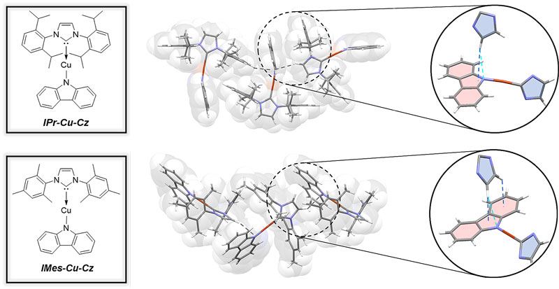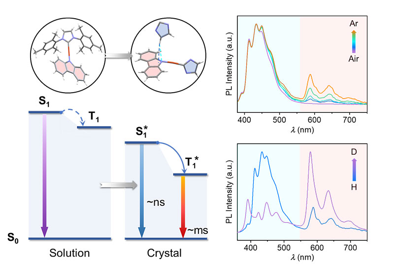 在这项工作中,作者首先设计合成了两种二配位Cu(I)配合物IPr-Cu-Cz以及IMes-Cu-Cz。单晶数据表明卡宾和咔唑配体呈正交构象,配合物中存在大量分子间次级作用,例如C-H•••N氢键、C-H•••π作用以及π•••π堆积。惰性气体下,其固体粉末具有独特的荧光/磷光双发射现象,荧光发射(400-550 nm)对氧气不敏感,寿命为101 ns量级;磷光发射(550-750 nm)在空气中被完全淬灭,随氧气浓度降低而显著增强,寿命为101 ms量级,因此能够在紫外激发撤去后观察到红色长余晖。这与此前所报道的Cu(I)配合物发光性质有显著的区别。