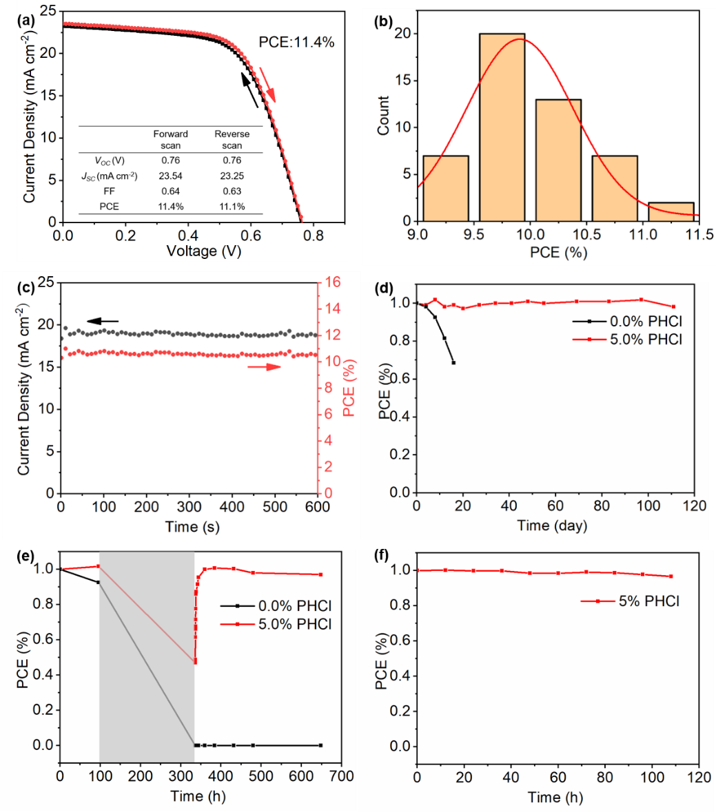 在这项工作中,作者发现在FASnI3前驱液中加入PHCl后,薄膜的晶粒变得大且光滑,但是当过量引入PHCl会有孔洞产生。通过瞬态光谱测试,发现PHCl引入后可以将载流子寿命从7.6 ns提升至25.6 ns,说明PHCl的引入有效的抑制了载流子的复合。通过采用氧化铟锡(ITO)/聚(3,4-乙撑二氧噻吩)聚苯乙烯磺酸盐(PEDOT:PSS)/FASnI3/C60/2,9-二甲基-4,7-二苯基-1,10-菲咯啉(BCP)/银(Ag)的反向器件结构制备的相应的太阳能电池,最佳器件的光电转化效率可达11.4%,并拥有极佳的可重复性。同时器件也具备较高的稳定性,将未封装的器件放在手套箱中可保证110天内接近零衰减。此外,将电池暴露在含氧环境10天后,可以发现其在短时间内表现出惊人的效率恢复特性。
