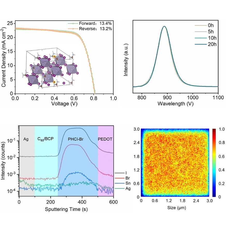锡基钙钛矿与铅基的相比具有更加合适的带隙、更为优异的载流子传输能力以及环境友好的特性,引起了科研工作者的广泛关注。然而,Sn2+易被氧化成Sn4+,使得其电池的效率和稳定性远落后于铅基钙钛矿太阳能电池。近日,本课题组在提升锡基钙钛矿太阳能电池效率和稳定性研究中取得新的进展,通过协同引入苯肼离子和卤素离子,将电池光电转化效率提高至13.4%(12.4%认证效率)——迄今报道的非铅钙钛矿太阳能电池效率的最高值。同时,器件具备非常优异的稳定性,放置在手套箱中4800 h后可保持初始效率的91%,在一个太阳光持续照射330 h下可保持初始效率的82%。