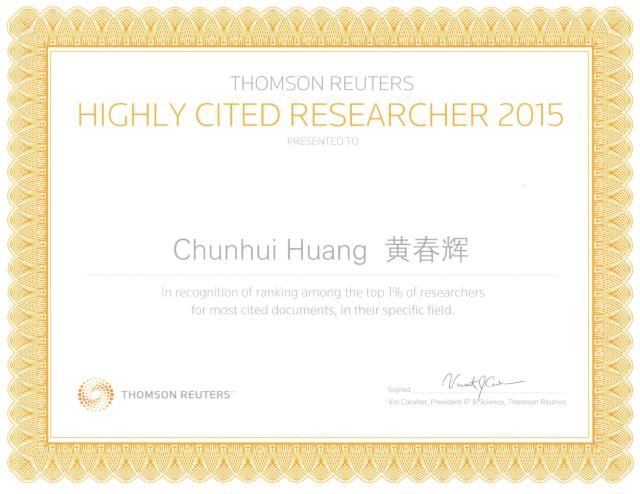 Prof. Chunhui Huang has cultivated over 40 Doctors of Science, among which 2 Doctor graduates have won the award of Top 100 National Doctoral Theses, in 1999 and 2003, respectively, and 3 young teachers have won the Chinese Chemical Society Award for Young. Since 2015, Prof. Huang has been recognized of ranking among the top 1% of researchers for most cited documents by THOMSON REUTERS.